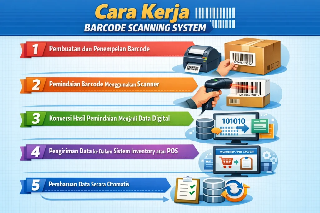 Barcode scanning system bekerja melalui alur otomatis yang menghubungkan barcode fisik dengan sistem digital. Setiap produk memiliki barcode unik yang berfungsi sebagai identitas, sehingga informasi dapat diakses tanpa pencatatan manual.