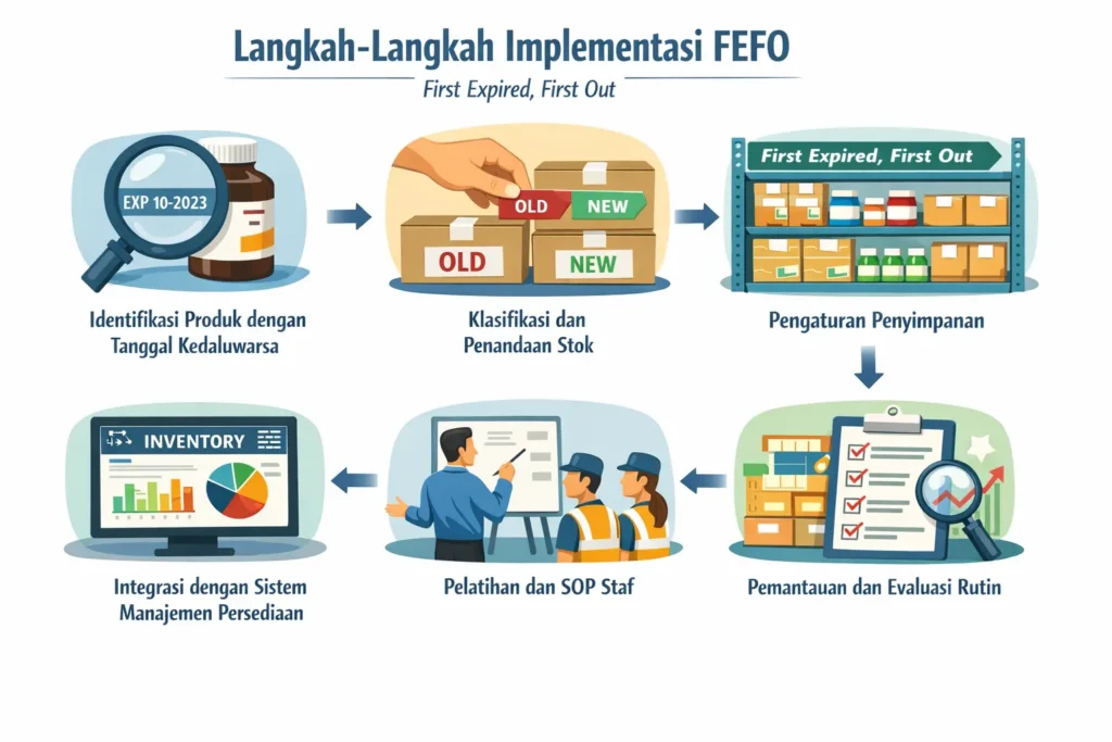 Penerapan FEFO membutuhkan koordinasi yang baik antara sistem manajemen persediaan, prosedur operasional, dan pelatihan staf agar proses berjalan konsisten dan efektif. Berikut langkah-langkah implementasi FEFO: