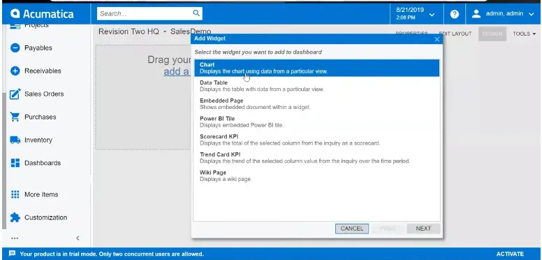 Dengan memanfaatkan widget, pengguna dapat menyusun dashboard yang menggambarkan kondisi bisnis secara menyeluruh dalam satu tampilan terpadu. Misalnya, tim keuangan dapat menggunakan widget KPI untuk memantau arus kas, sementara tim penjualan dapat menampilkan grafik penjualan harian atau pelanggan dengan tagihan tertunggak. Kombinasi berbagai jenis widget inilah yang menjadikan dashboard Acumatica ERP sebagai alat analisis yang kuat, interaktif, dan mudah disesuaikan dengan kebutuhan bisnis.
