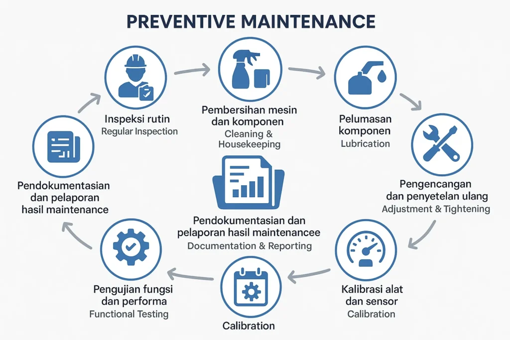 Preventive maintenance mencakup serangkaian aktivitas terencana yang bertujuan menjaga peralatan tetap berfungsi optimal sebelum terjadi kerusakan. Kegiatan ini dilakukan berdasarkan jadwal waktu, jumlah jam penggunaan, atau kondisi aktual mesin untuk memastikan keandalan operasional dan mencegah downtime tak terduga.
